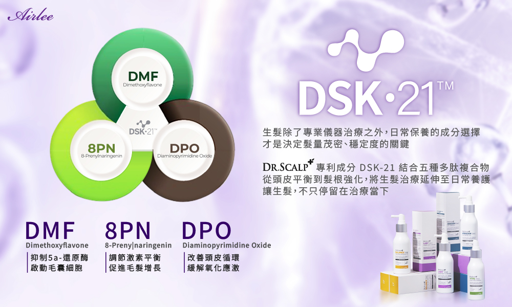 DSK-21 專利複合成分結合五種多肽複合物,著重於頭皮平衡、毛囊調理與循環支持