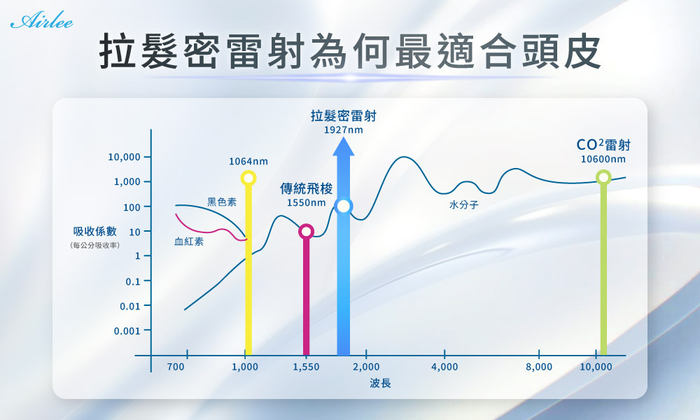 1927奈米波長不過度破壞表皮、不作用於黑色素更適合頭皮組織結構