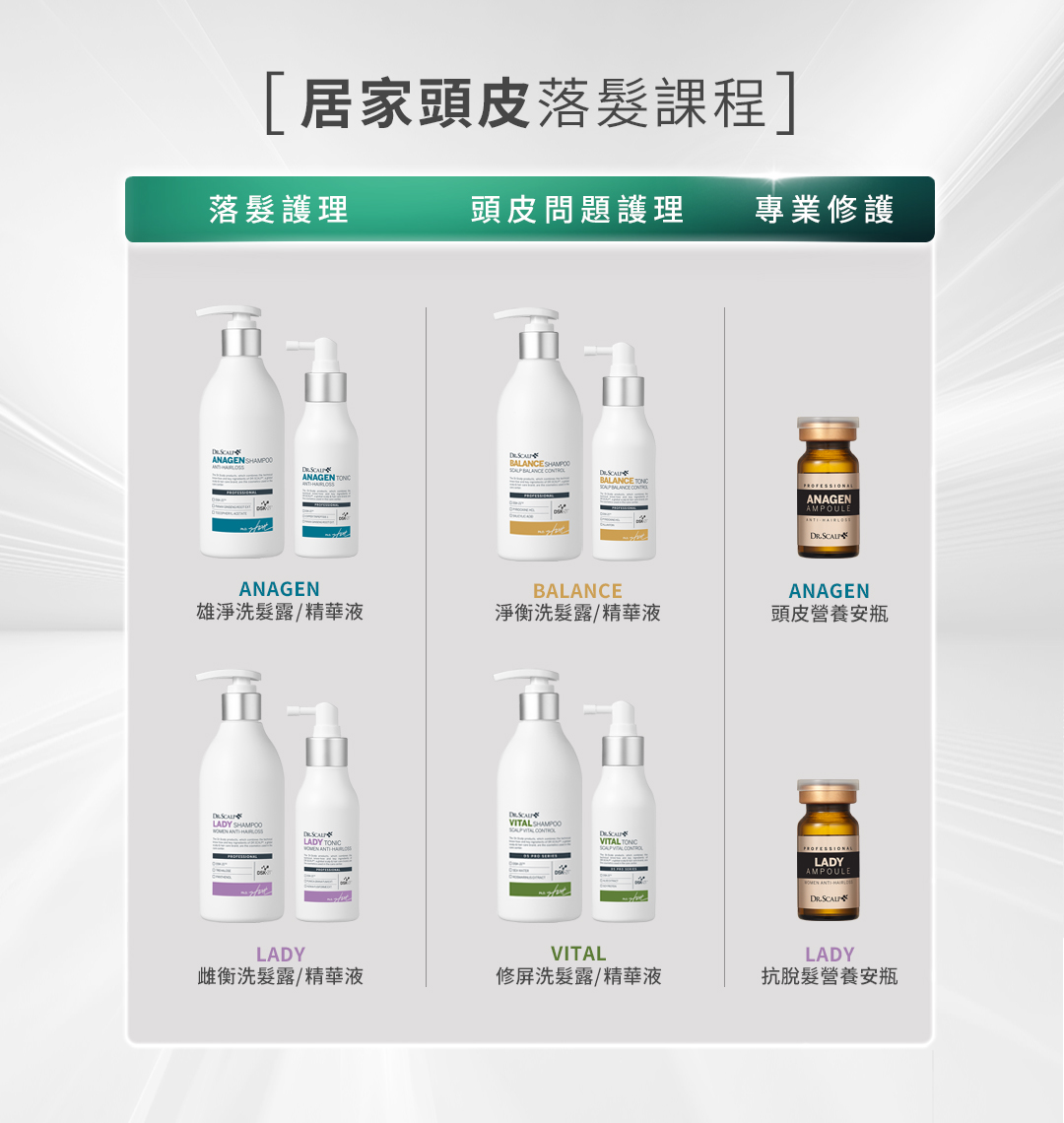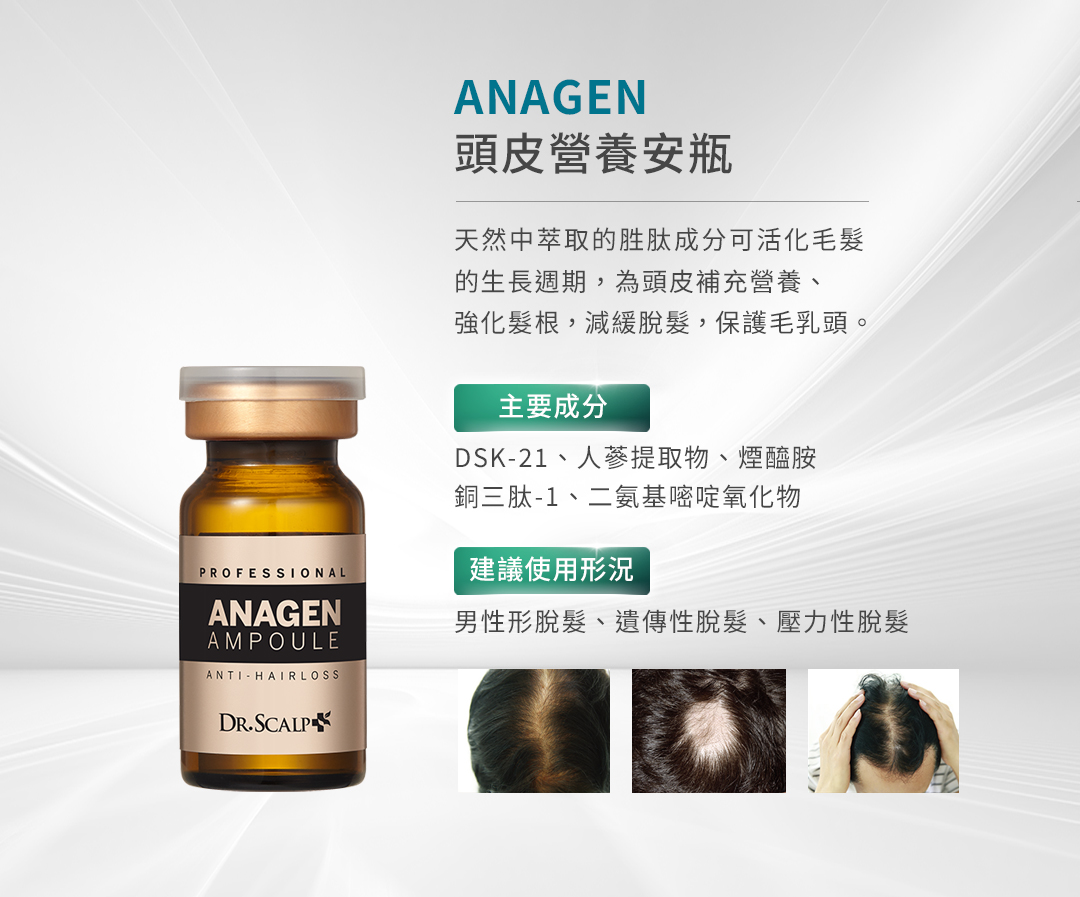 DR.SCALP Anagen Ampoule 專為追求極致生髮成效。這款專業級安瓶,集結精選的高滲透營養成分,深入頭皮根源精準修復受損毛囊。特別添加「天然胜肽複合配方」,能有效喚醒休眠中的毛髮生長因子。針對遺傳性脫髮與頭髮稀疏困擾,這份專家級配方能提供集中護理、告別脫髮危機以及重塑強韌豐盈的髮絲。
